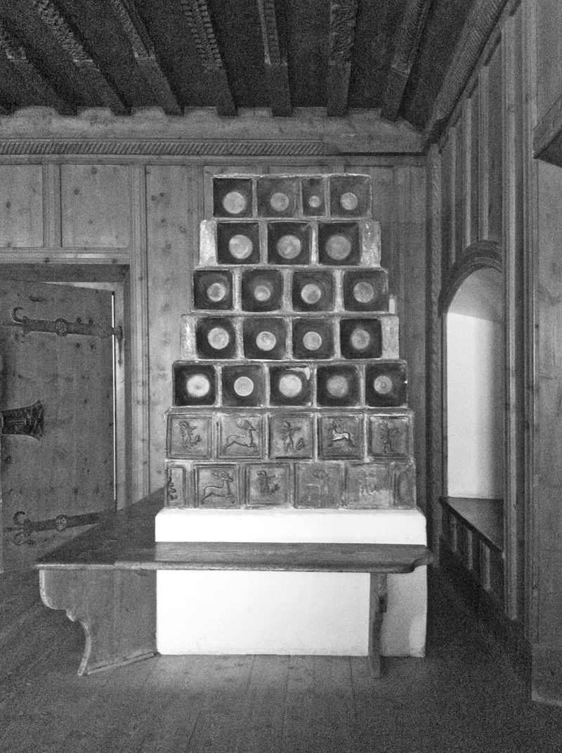 In einer quadratischen Stube, jener aus dem Gerichtshaus in Niederndorf im Pustertal, steht ein gotischer Kachelofen aus dem 16. Jahrhundert, der ursprünglich aus Kufstein stammt. Eine dunkle, steile Stufenpyramide, klar rechteckig, 106 x 144 cm auf weißem Sockel und 144 cm hoch. „Graphitiert“ steht in der Beschreibung und meint wohl die Behandlung der Kacheloberfläche.