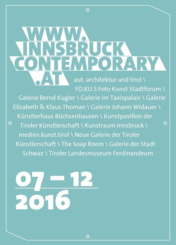aut. architektur und tirol, FO.KU.S Foto Kunst Stadtforum, Galerie Bernd Kugler, Galerie im Taxispalais, Galerie Elisabeth & Klaus Thoman, Galerie Johann Widauer, Künstlerhaus Büchsenhausen, Kunstpavillon, Kunstraum Innsbruck, medien.kunst.tirol, Neue Galerie der Tiroler Künstlerschaft, The Soap Room, Stadtgalerie Schwaz, Tiroler Landesmuseum Ferdinandeum