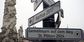 Landschaftsarchitekt und Spaziergangsleiter Dominik Scheuch startete den Rundgang am Rathausplatz (Planung: Boris Podrecca) vor dem Wegweiser der Kulturhauptstädte Europas, der derzeit mit all seinen Anzeigern ganz im Verkehrszeichen-Design den bereits seit 30 Jahren autofreien Freiraum ziert. Den Schriftzug „SANKT“ hatte er auf einem Schild mitgebracht – exakt abgestimmt auf die Farben der Europäischen Union. Von da aus brach die etwa 60-köpfige Gruppe auf, nicht ohne den verheißungsvollen Satz „Die Stadt ist mir heilig.“ zu hinterlassen.