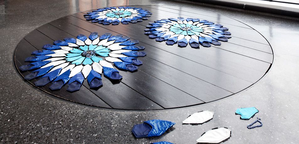 Im aut zeigt Aksamija ihr von der islamischen Ornamentik inspiriertes Projekt „Flocking Mosque“, eine Moschee aus Textil, die die geometrischen Muster islamischer Bauwerke aufnimmt und sie dem Verhalten der Gläubigen gegenüberstellt. Ein Blütenkranz bietet zwölf Gläubigen Raum für ihr Gebet und stellt eine saubere Oberfläche für jene Körperteile zur Verfügung, die dabei den Boden berühren: zwölf Paar Hausschuhe, zwölf Paar Handkissen, zwölf Kopfkissen und in der Mitte ein Beutel mit zwölf Gebetskränzen und einem Kompass. Das geometrische Muster - Ausdruck der Logik und Ordnung, die der islamischen Sichtweise des Universums innewohnen - wird im Gebrauch zur visuellen Analogie der religiösen Verhaltensweisen.