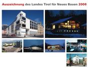 ausstellungSeit 1996 zeichnet die Kulturabteilung im Amt der Tiroler Landesregierung gemeinsam mit der Kammer der Architekten und Ingenieurkonsulenten für Tirol und Vorarlberg – Sektion Architekten, der ZV – Zentralvereinigung der Architekten Österreichs – Landesverband Tirol und aut. architektur und tirol alle zwei Jahre vorbildliche Bauten in Tirol aus. Aus den 93 Projekten, die 2006 zum Wettbewerb eingereicht wurden, hat die Jury – die Architekten Valentin Bearth (Bearth + Deplazes Architekten, Chur) und Michael Hofstätter (PauHof, Wien) sowie der Architekturtheoretiker Bart Lootsma (Innsbruck) – zwei Auszeichnungen und fünf Anerkennungen für Bauten vergeben, die dem Kriterium einer besonders vorbildlichen Auseinandersetzung mit den architektonischen Herausforderungen unserer Zeit sowohl in ästhetischer wie in innovatorischer Hinsicht entsprechen.