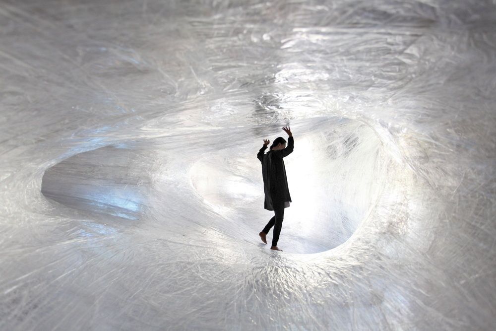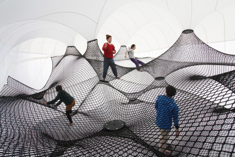 ausstellung„Tape“, „Tuft“, „Net“, „Net Blow-up“, „String“ – unter diesen prosaischen Titeln verwirklicht das Kollektiv Numen/For Use begehbare, interaktive Installationen, die faszinierende sinnlich-räumliche Erlebnisse bieten. Sie spinnen aus Klebebändern fragil wirkende Kokons, die aussehen, als wäre ein Rieseninsekt tätig gewesen, verweben mehrere Schichten elastischer Netze zu überdimensionalen, durchkletterbaren Hängekonstruktionen im öffentlichen Raum oder eignen sich das Produktionssystem großer pneumatischer Objekte in einer Weise an, dass man sich in einem unendlich scheinenden 3-D-Netz verliert.