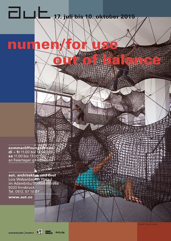 Für die Ausstellung „Out of Balance“ im aut entwickelte Numen/For Use eine völlig neuartige Form der Installation, in der die Konzepte von Tape, Net und String kombiniert werden. Ausgehend von der bestehenden Architektur spannt sich eine begehbare, röhrenartige Netzkonstruktion von der Galerie über die Lounge bis in die untere Ebene. Neben dieser, die BesucherInnen aktiv involvierenden Rauminstallation, zeigt Numen/For Use ein pneumatisches Objekt sowie eine N-Light Membrane und gibt – anhand von Arbeitsmodellen, Filmen und Fotos – einen Einblick in den Entstehungsprozess der raumgreifenden Installationen und szenographischen Arbeiten des Kollektivs.