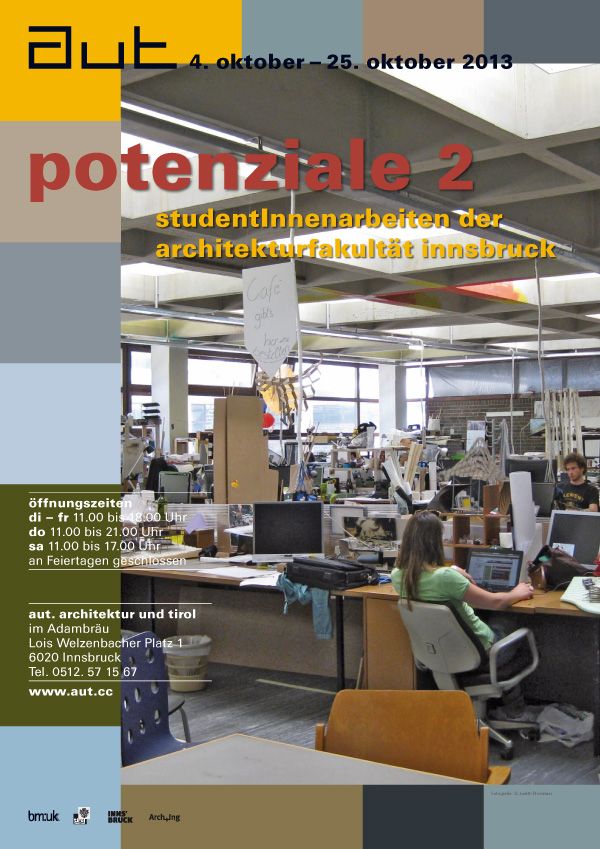 ausstellungIm Jahr 2003 präsentierte das damalige Architekturforum Tirol in seinen Räumlichkeiten in der Erlerstraße in Zusammenarbeit mit allen Architekturinstituten der Technischen Fakultät der Universität Innsbruck eine repräsentative Auswahl von StudentInnenarbeiten. Zehn Jahre später bietet die Ausstellung „potenziale 2“ wieder einen Einblick in die auf den einzelnen Instituten der – inzwischen eigenständigen – Architekturfakultät entwickelten Projekte.