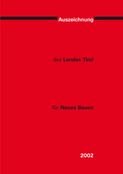 Aus den 87 Projekten, die zur „Auszeichnung des Landes Tirol für Neues Bauen 2002“ eingereicht wurden hat die Jury – Bettina Götz (ARTEC Architekten, Wien), András Pálffy (Jabornegg & Pálffy, Wien) und Dietmar Steiner (Direktor Architekturzentrum Wien) mit der mit der Bergiselschanze von Zaha Hadid und dem MPREIS Supermarkt in Wenns von Rainer Köberl und Astrid Tschapeller zwei Bauten eine Auszeichnung verliehen, 5 weitere Projekte erhielten Anerkennungspreise.