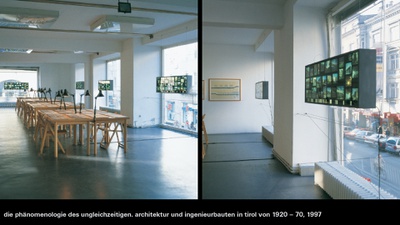 Ausstellung der Preisträger und Einreichungen zur "Auszeichnung des Landes Tirol für Neues Bauen 2004", die einen repräsentativen Querschnitt durch die Tiroler Architekturlandschaft der unmittelbaren Vergangenheit bietet.