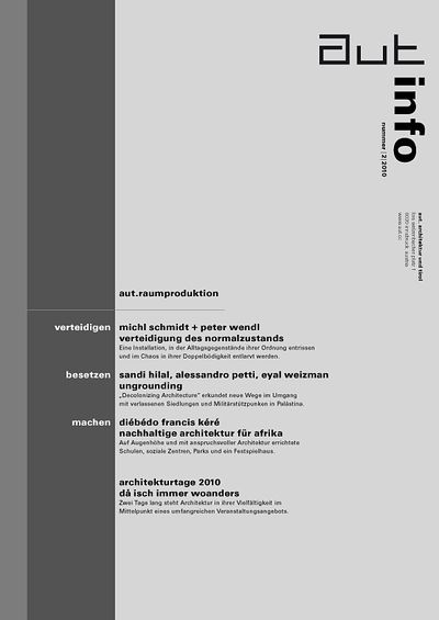 Die Ausgabe 2/10 der Programmzeitschrift aut: info mit Hintergrundinformationen zum zweiten Teil der Ausstellungsreihe "aut.raumproduktion" sowie zum Programm des aut zwischen April und Juni 2010.
