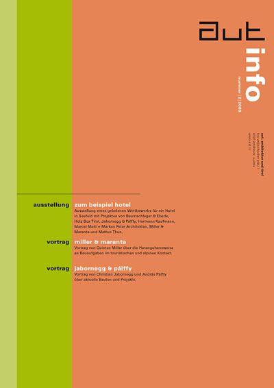 Die Ausgabe 2/09 der Programmzeitschrift aut: info mit Hintergrundinformationen zur Ausstellung „Zum Beispiel Hotel“ sowie zum Programm des aut im April und Mai 2009.