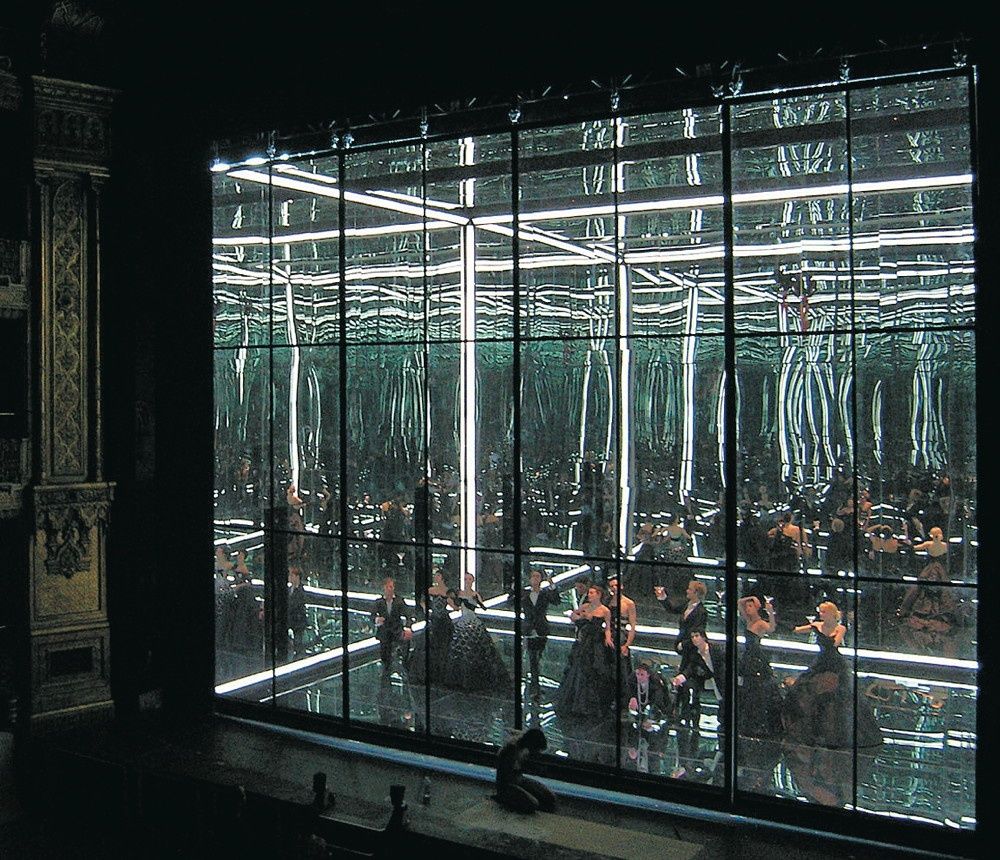 „inferno“ Bei diesem Bühnenbild für ein auf Dantes „Inferno“ basierendes Theaterstück am Centro Dramático Nacional in Madrid vergrößerten wir das experimentelle Konzept von N-Light auf die gesamte Bühne, um so einen virtuellen Raum des Jenseits zu schaffen. Die Interpretation von Inferno als eine unendliche gespiegelte Wiederholung des Ichs, der nicht enden wollende kartesische Lichtraster als Synonym für die westliche Logik und eine kalte endlose Hölle waren die Leitmotive für den Entwurf.
