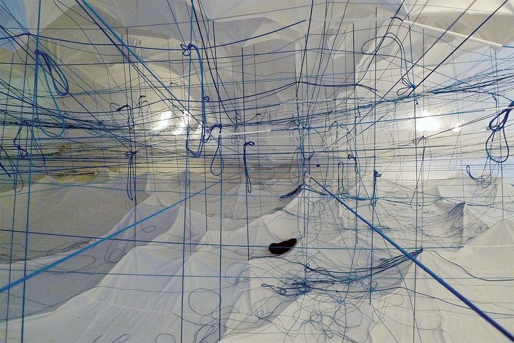string vienna Die Installation baut auf einem bekannten Produktionssystem großer pneumatischer Objekte auf. Um kubische Formen zu erzeugen, werden dünne Seile parallel von Seite zu Seite gespannt. Sind diese Objekte aufgeblasen, so spannen sich die Seile zu perfekten Linien, stark genug, um das Gewicht von Menschen zu tragen. Die in diesem dreidimensionalen Raster gefangenen Körper scheinen ähnlich einer surrealen Collage durch den weißen Raum zu schweben. Weder Maßstab noch Lage im Raum sind eindeutig wahrnehmbar, womit ein Gefühl von Unendlichkeit und Abwesenheit von Raum entsteht.