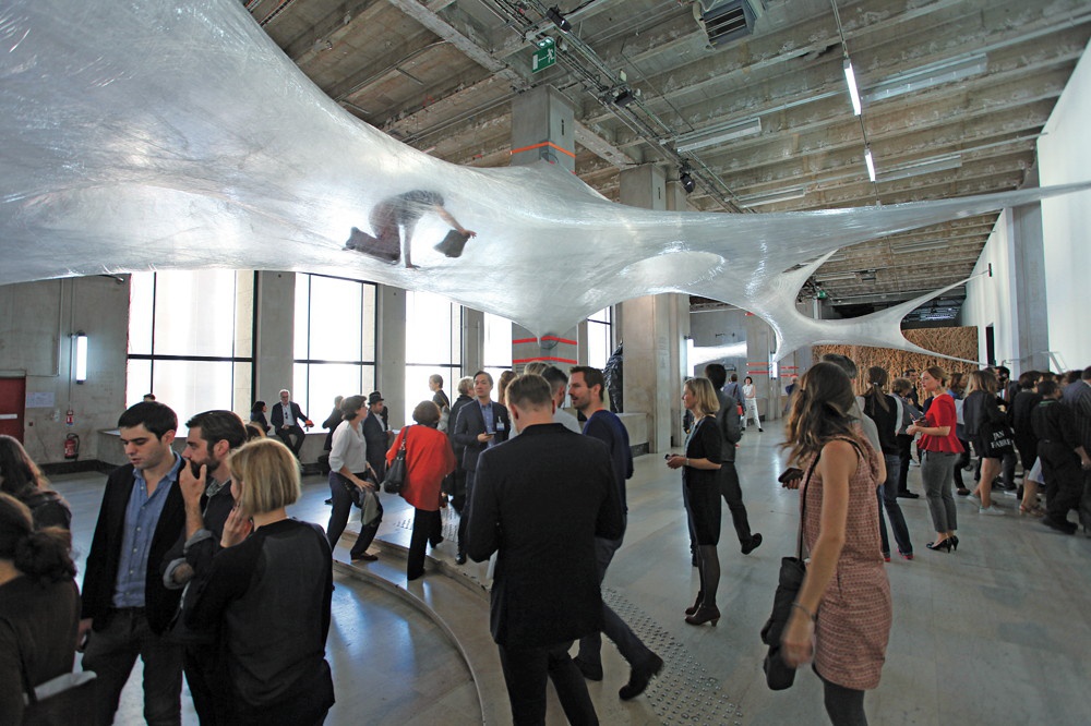 Die sich ausbreitende biomorphe Hülle von Tape Paris markierte in der großen Eingangshalle den Beginn dieses Experiments und verkörperte die Idee einer nach innen gewandten Betrachtungsweise. Zwölf Personen arbeiteten zehn Tage lang daran, ein Labyrinth aus durchscheinenden Gängen zwischen die Betonpfeiler der Halle zu spannen, eine 6 m hohe und 50 m lange Raumskulptur, gemacht aus 43 km Klebeband.