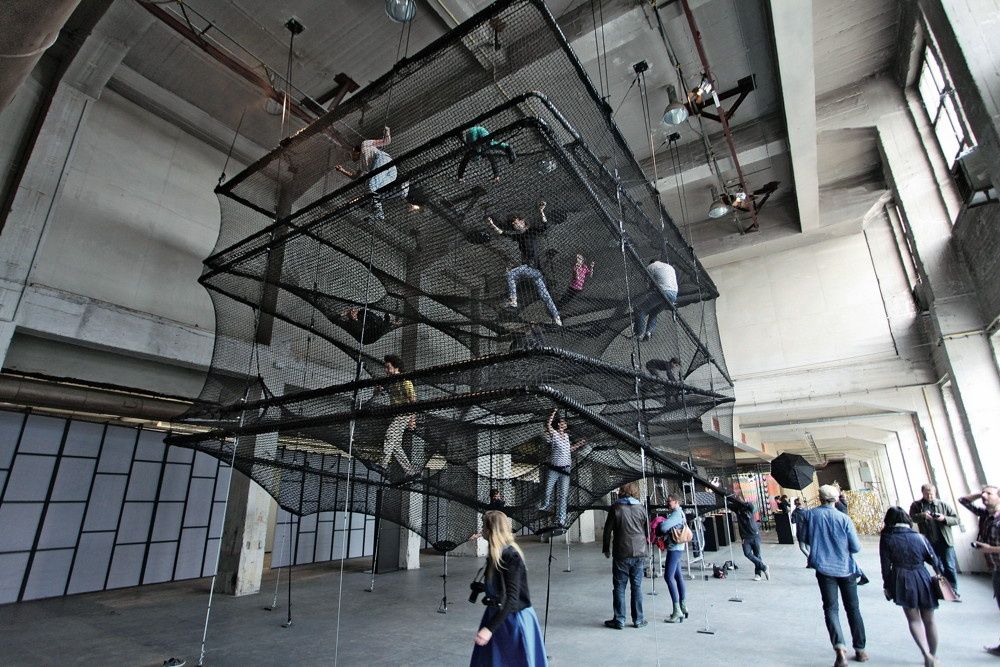 Obwohl bisher nur im Rahmen von Ausstellungen gezeigt, ist unser eigentliches Ziel, damit Hinterhöfe von Wohnhäusern zu beleben. Die in jedem Stockwerk von Mauer zu Mauer gespannten Netzebenen könnten von den Bewohnern direkt aus ihren Fenstern bestiegen werden, wären also eine Art gemeinschaftlicher Balkon.