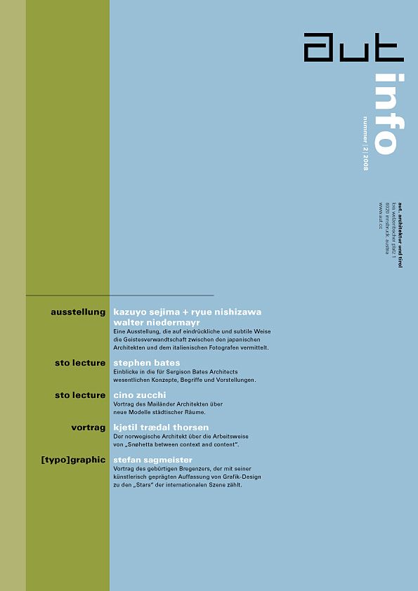 Im Mittelpunkt dieser Ausgabe der aut: info steht eine Vorschau auf die von März bis Juni 2008 im aut gezeigte Ausstellung „Kazuyo Sejima + Ryue Nishizawa (SANAA) und Walter Niedermayr“. Die ganz spezielle und einmalige Ausstellung zeigt das Ergebnis eines Dialogs zwischen den japanischen Architekten Kazuyo Sejima und Ryue Nishizawa, die mit ihrem in Tokio ansässigen Büro SANAA inzwischen weltweit zu einem der anerkanntesten Architekturbüros zählen und dem italienischen Künstler Walter Niedermayr.