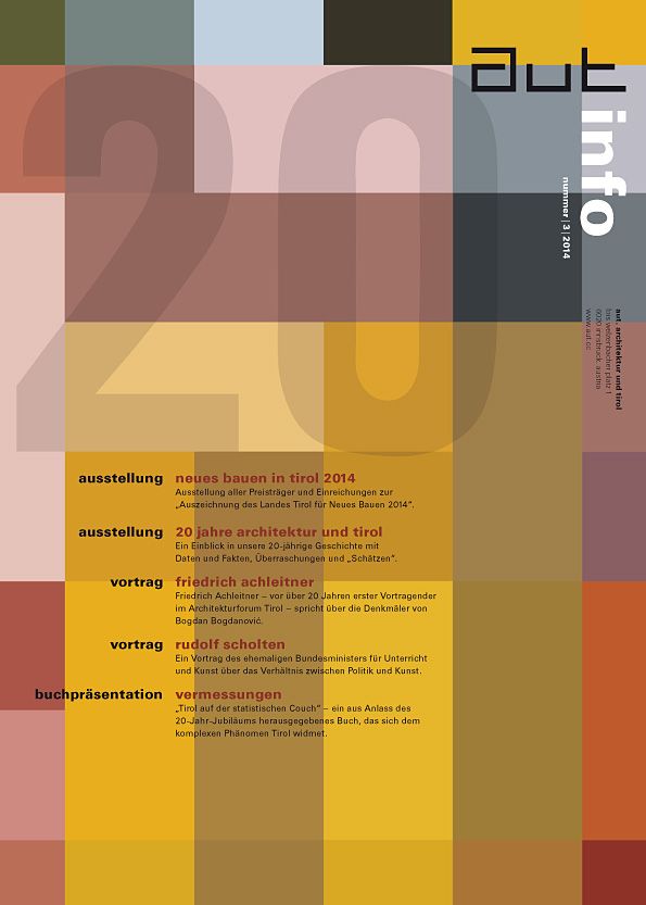 Anlässlich des 20-Jahr-Jubiläums ist eine umfangreiche Sonderausgabe unserer Programmzeitschrift aut: info erschienen, die einen Einblick in die 20-jährige Geschichte des aut bzw. des Architekturforum Tirol bietet und das breite Tätigkeitsfeld sichbar macht. Jedem Jahr seit der Gründung 1993 ist eine Seite gewidmet, die einen Überblick über die in diesem Jahr gezeigten Ausstellungen bzw. Veranstaltungen gibt. Darüberhinaus steht jedes Jahr für ein Thema – von der Vereinsgeschichte über die unterschiedlichen Veranstaltungs- und Ausstellungsformate, das Aufarbeiten, Dokumentieren und Publizieren bis zu den Kooperationen und politischen Interventionen. An diesem Grundkonzept orientiert sich auch die Ausstellung "20 jahre architektur und tirol. was war es was wir wissen wollen", die von 15. Oktober bis 18. November 2014 im aut zu sehen ist.