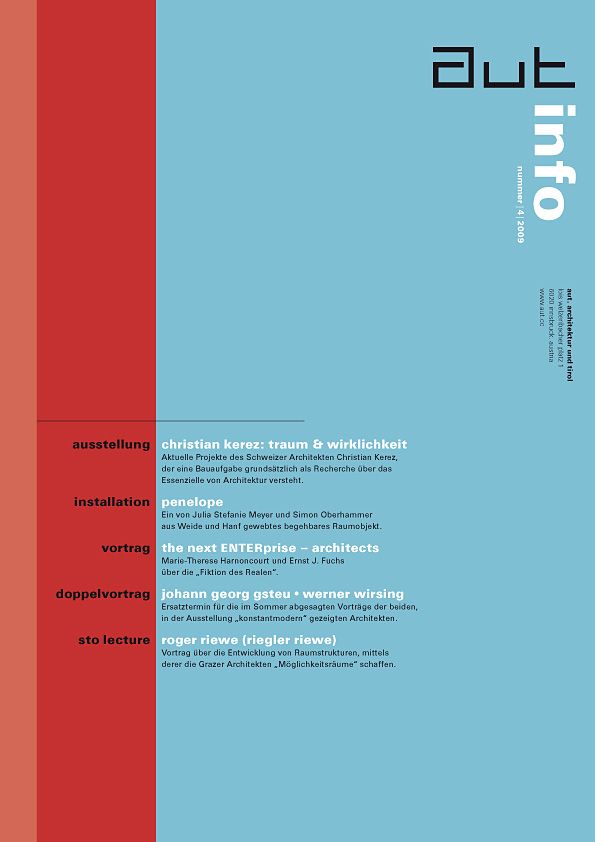 Neben Hintergrundinformationen zur Ausstellung von Christian Kerez und zum Projekt „Penelope“ bietet die aut: info einen Überblick über das weitere Programm des aut im Herbst 2009, u. a. mit Vorträgen von Christian Kerez, Hans Frei, the next ENTERprise - architects, Matthias Kohler (Gramazio & Kohler), Johann Georg Gsteu, Werner Wirsing und Roger Riewe (Riegler Riewe), vier „Vor Ort“-Gesprächen und einem Festabend für Norbert Heltschl.