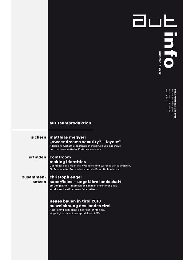 Daneben bietet die aut: info weiterführende Informationen zum dichten und vielfältigen Programm des aut im Herbst 2010, u. a. der Preisverleihung der „Auszeichnung des Landes Tirol für Neues Bauen 2010“, Vorträge von feld72, Stephan Günzel und Tobias Scholz sowie ein Filmabend mit Mo Asumang, mehrere „Vor Ort“-Gespräche und ein „nimm 3“ zum Thema „Platz gemacht“.