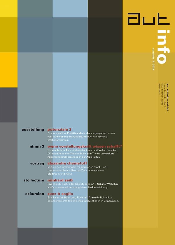 Im Mittelpunkt der aktuellen Ausgabe der aut: info steht die im Oktober 2013 im aut gezeigte Ausstellung "Potenziale 2" , in der eine Auswahl von Projekten zu sehen sind, die in den vergangenen Jahren von Studierenden der Architekturfakultät Innsbruck erarbeitet wurden. Jeweils zwei der insgesamt 8 Institute bzw. Arbeitsbereiche teilen sich einen Raum des aut und präsentieren – frei von inhaltlichen und formalen Vorgaben – Arbeiten und Projekte aus den verschiedensten Phasen der universitären Ausbildung.