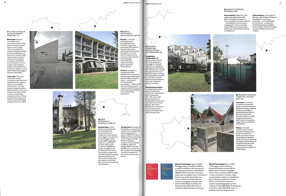 „In 2004, my brother Werner and I began to systematically photograph troughout northern Italy. We were first and foremost interested in the buildings themselves, and only as the project progressed did we begin to take note of the architects’ distinct biographies. When we learned that we would have the opportunity to exhibit our photos at aut, Innsbruck’s architecture gallery, our work intensified. At this point, we had to find a title for our endeavor, a title that would embrace the scope of the projects. Disregarding fiercely contested demarcation lines, I simply called it ITALOMODERN. The first phase, wich culminated in the exhibition in Innsbruck in 2011, documented 84 structures. A second exhibition with 132 additional works followed four years later. Each of the exhibitions was accompanied by a catalogue.“ Martin Feiersinger im DOMUS 1013