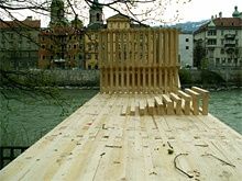 Bereits ab April kann im Walther-Park mitverfolgt werden, wie aus einfachen Holzlatten eine Architekturskulptur entsteht, die metaphorisch das Thema des Schwemmholzes aufnimmt. Während der Architekturtage wird der Ort zum Veranstaltungsraum, Treffpunkt und Ausgangspunkt für Stadtspaziergänge und Bauwerksbesichtigungen. Und auch nach den Architekturtagen kann man „an den Inn wollen“ - die beleuchtete, über den Inn auskragende Plattform bleibt den ganzen Sommer über stehen und lädt dazu ein, ein Stück öffentlichen Raum in Besitz zu nehmen.