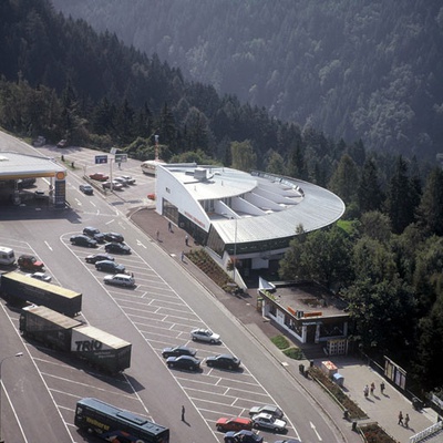 Führung mit den Architekten Karl Heinz, Dieter Mathoi und Jörg Streli durch das Autobahnrasthaus.