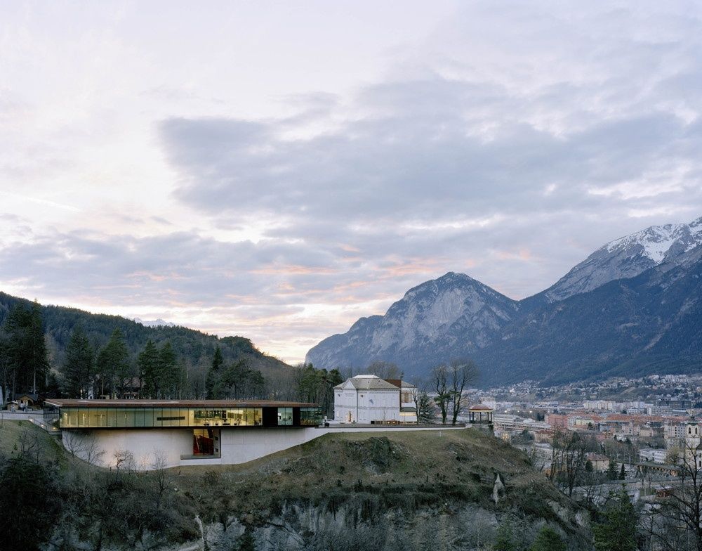 Die Architekten lösen die komplexe Aufgabenstellung an dem historisch wie landschaftlich bedeutsamen Ort mit einem zurückhaltend gestalteten Baukörper, der das Ensemble ohne heroisierende Geste klar außenräumlich abschließt. Vom Bergisel aus gesehen belegt ein flacher Solitär die Hangkante zur Sillschlucht, während in Richtung der Hauptverkehrsrouten das in eine Mulde abgesenkte Volumen für das Rundgemälde mit skulpturaler Präsenz in Erscheinung tritt. Im Inneren umfassen und überlagern offene Raumfolgen die introvertiert gestalteten Ausstellungsbereiche, an die das sanierte „Kaiserjägermuseum“ unterirdisch angebunden ist, zwischen Alt- und Neubau entsteht ein großzügiger Vorplatz.