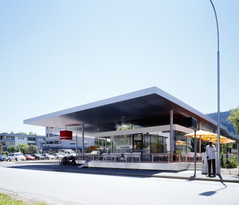 Im Gegensatz dazu präsentiert sich der weiter westlich liegende, neue MPREIS Supermarkt als sehr horizontales Gebäude. Bestimmendes Element ist das bis an die Straße weit auskragende Dach, unter dem die einzelnen Funktionsbereiche gut ablesbar angeordnet sind. Die an dieser Stelle eher zufällig entstandene Konzentration von öffentlichen Funktionen wie Bushaltestellen, Bank und Apotheke wird mit dem neuen Lebensmittelmarkt und seinem zur Straße hin gelegenen Cafébereich zu einem kleinen Stadtteilzentrum.