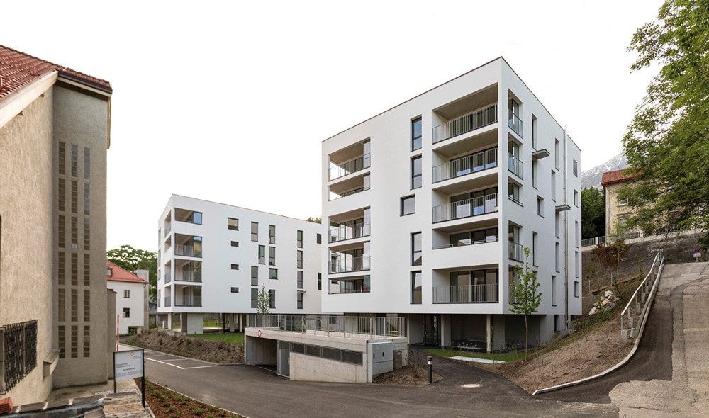 Im Anschluss an das „Vor Ort“-Gespräch im transformierten Priesterseminar bietet sich die Möglichkeit, einen in unmittelbarer Nähe errichteten Wohnbau gemeinsam mit den Architekten Helmut Reitter, Clemens Bortolotti und Tilwin Cede zu besichtigen. Das von der Diözese zur Verfügung gestellte Grundstück liegt an der Höhenstraße in einer überwiegend klein strukturierten, villenartigen Bebauung mit ausgeprägter Durchgrünung und grenzt westlich an den dörflichen Bereich von Hötting und die neue Höttinger Pfarrkirche.