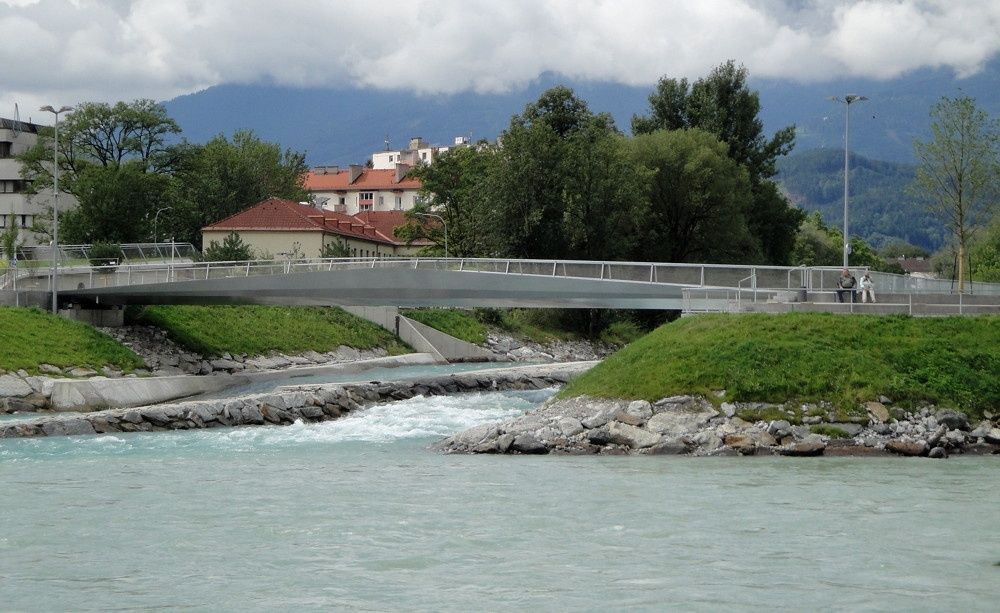 Hans Peter Gruber (Architektur) sowie Thomas Sigl und sein Mitarbeiter Paul Meßner (Tragwerksplanung) errichteten eine pfeilerlose Brücke mit bootsförmigem Querschnitt und einer Spannweite von 42 m. Die Widerlagerkonstruktionen aus Stahlbeton sind im Kronenbereich der befestigten Uferböschung integriert, und das Tragwerk an beiden Ufern drehbar auf Elastomerlagern aufgesetzt. Als Zuschauerbereich für die neu entstandenen Sportmöglichkeiten wurde die Dammkrone zwischen Altarm und neuer Sillmündung mit drei, im Grundriss wellenförmigen Sitzstufen abgetreppt.