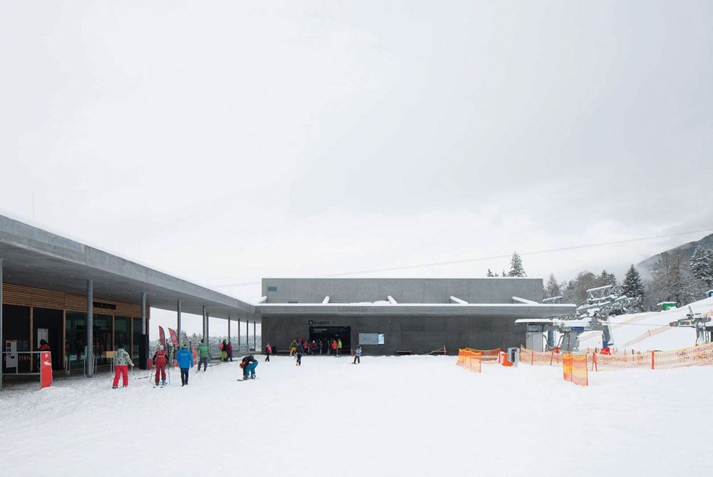 Das 2016 aus einem geladenen Architekturwettbewerb hervorgegangene Siegerprojekt der Vorarlberger Architekten Innauer Matt zeichnet sich durch eine sehr strenge und puristische Herangehensweise aus, die den Fokus auf die Funktion legt. Alle drei Stationsbauten bestehen aus quaderförmigen, in Sichtbeton ausgeführten Baukörpern mit einem mittig liegenden, höheren und weitgehend geschlossenen Kubus für die Seilbahntechnik und daran angelagerten, zum Teil weit auskragenden und transparenteren Bauteilen für die verschiedenen Zusatzfunktionen.