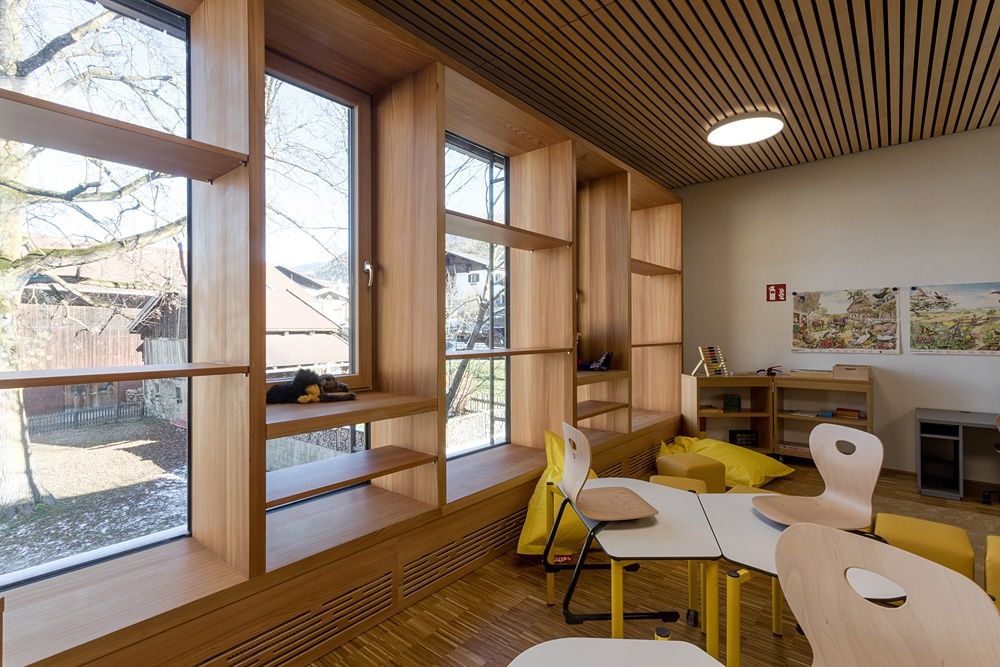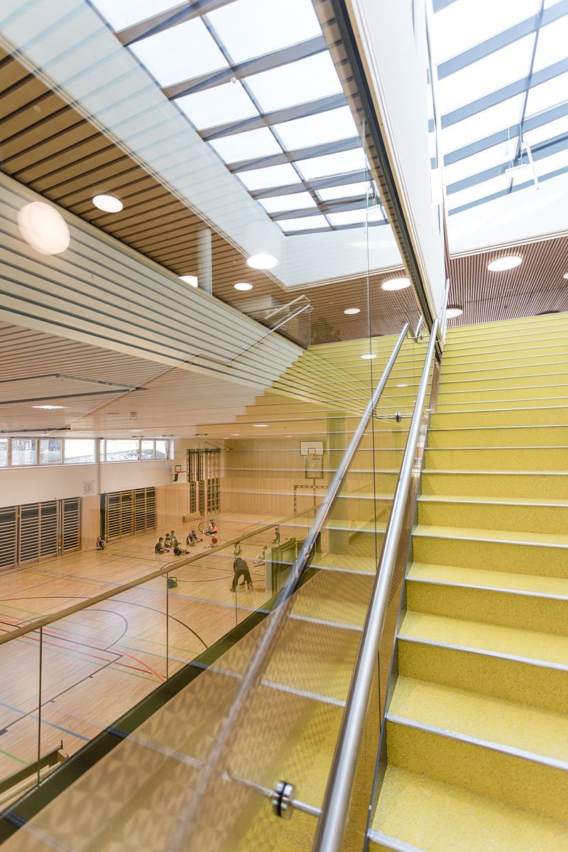 Entstanden ist ein zweigeschoßiger Baukörper mit einer Fassade aus Lärchenholz, der sich mit einem großzügig überdachten Zugangsbereich zum Ort hin öffnet. Den zentralen Platz im Erdgeschoß nimmt die Aula mit Musik-Medienraum ein, die räumlich mit der im Untergeschoß situierten Turnhalle verbunden ist. Angeschlossen an den Musik-Medienraum konzentrieren sich die Flächen für die Musikschule und die Musikkapelle im Westen des Gebäudes. Die „eigentliche“ Schule ist im Obergeschoß rund um eine helle Mitte in Form von vier Clustern aus jeweils zwei Klassen und einem offenen Lernbereich organisiert. Dieser Teil ist komplett abtrennbar, wodurch Turnhalle und Erdgeschoß für Veranstaltungen unterschiedlichster Art und Größe genutzt werden können.
