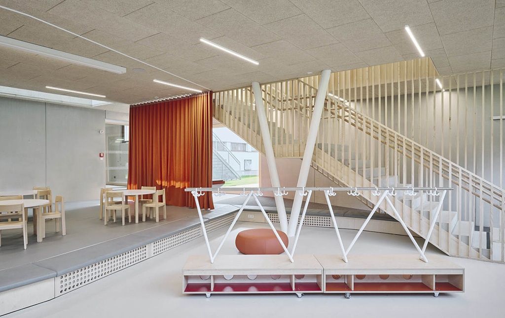 Über eine Rampe erreicht man im Nordwesten ebenerdig das eigentliche Obergeschoß, in dem sich der gemeinsame Bewegungsraum, die Personalräume und die Kinderkrippe samt vorgelagerter Spielterrasse befinden. Darunter liegt der, nach Südosten über raumhohe Fenster geöffnete Bereich des Kindergartens. Oberlichter, raumhohe Fenster und der verglaste Boden der Rampe bringen viel Licht in das Innere, das durch offene Raumabfolgen und eine reduzierte Materialauswahl geprägt ist.