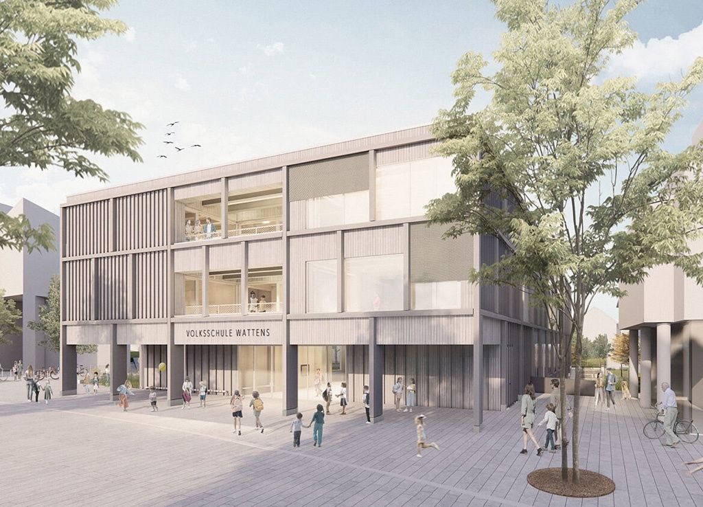 Am Kirchplatz im Zentrum von Wattens wird 2026 eine neue Volksschule mit 11 Klassen, Aula, Mittagstisch und Turnhalle in Betrieb genommen. Mit einem einfachen und klaren, über dem Haupteingang auskragenden Baukörper konzipierten die Architektinnen einen Gegenpol zur gegenüberliegenden Mittelschule, der sich selbstbewusst in die heterogene Bebauung einfügt und viel Platz für einen qualitätsvollen Freiraum lässt.