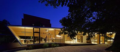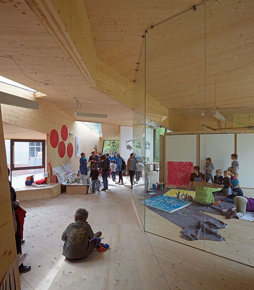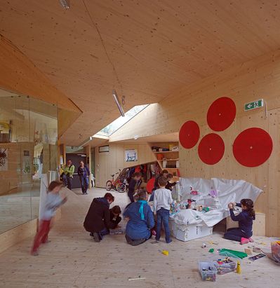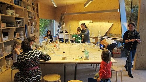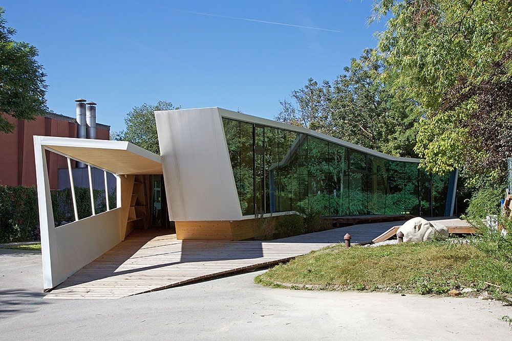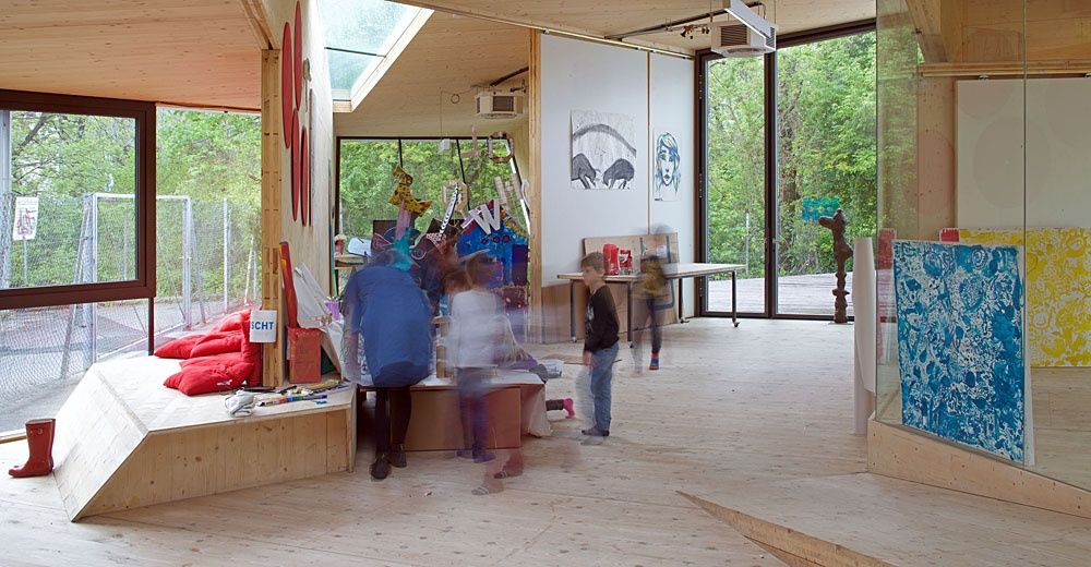 Entstanden ist ein pavillonartiges Werkstättengebäude, das nicht nur den Kindern und Jugendlichen als NutzerInnen ein optimales Raumangebot bietet, sondern auch den Park durch seine einzigartige Architektur bereichert. Vorgelagerte Terrassen und raumhohe Glasfronten verbinden den geschwungenen Baukörper mit der Umgebung, im Inneren bilden schräge Böden und Wände ein fließendes Kontinuum an Räumen mit unterschiedlichen Atmosphären und Arbeitsmöglichkeiten.