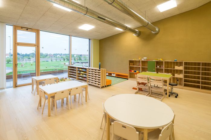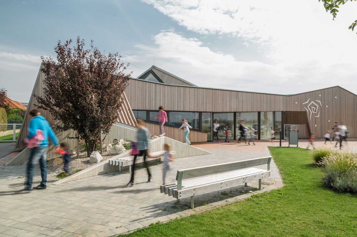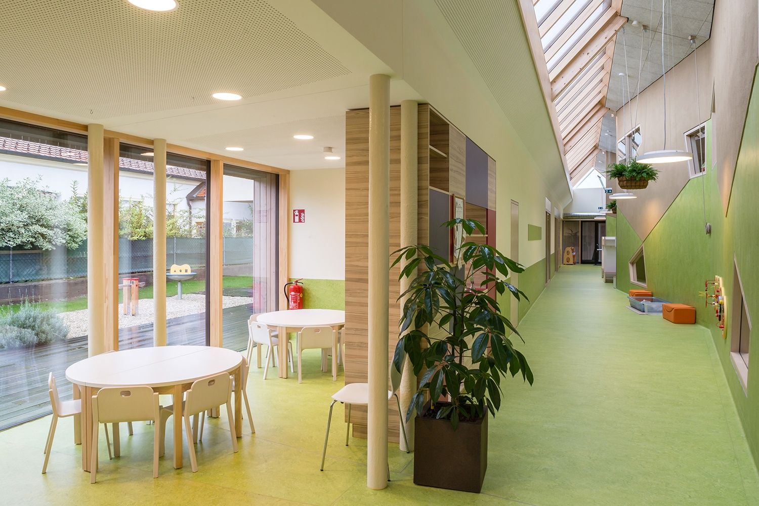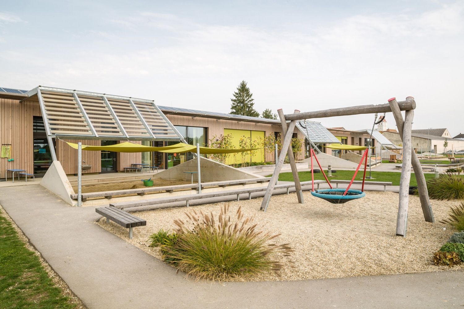 Der 2015 fertiggestellte und 2017 erweiterte 6-gruppige Kindergarten-Neubau in Holzriegelbauweise entspricht dem Passivhausstandard unter Verwendung ökologischer Baumaterialien und beinhaltete ebenso die Mitgestaltung des öffentlichen Raums.
