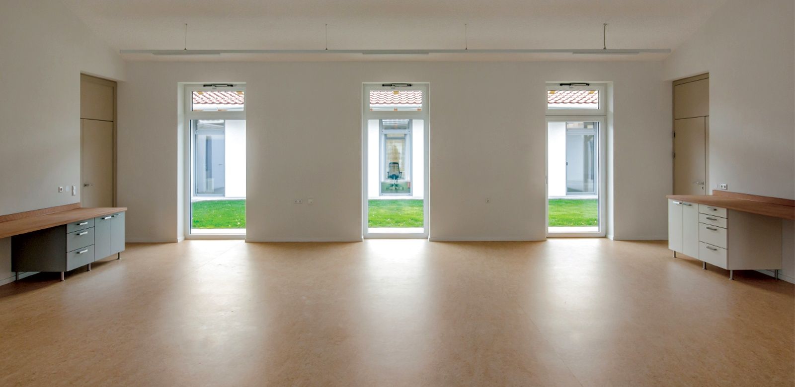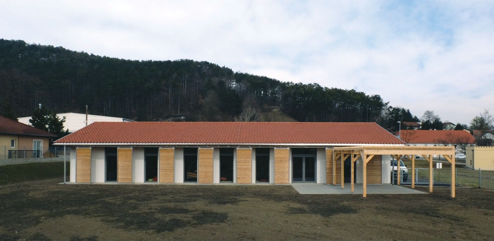 Besonderes Augenmerk wurde gelegt auf die Qualität der Belichtung und Beschattung der Räume; weit auskragende Dachüberstände beschatten die großzügig dimensionierten Fenstertüren, die von Nord und Süd Licht in die bis unters Dach offenen Gruppenräume lassen. Die Räumlichkeiten der Einrichtung sind so konzipiert, dass Menschen mit erhöhtem Unterstützungsbedarf die Möglichkeit haben überall zu arbeiten. [Quelle: www.noe.lebenshilfe.at]