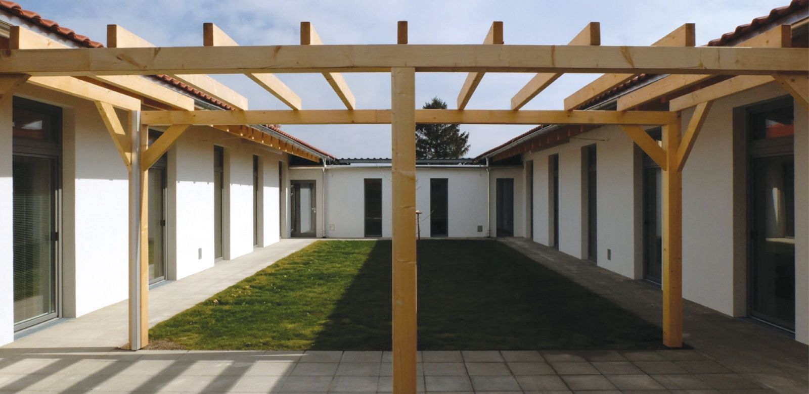 Häuser und Innenhöfe bieten eine Abfolge von öffentlichen und privaten Funktionen, von laut zu leise an. Einladend und für alle offen das erste Haus, hier findet Begegnung stattf; Begegnung der KlientInnen beim gemeinsamen Mittagessen, aber auch Begegnung mit Gästen und KundInnen, sei es beim Verkauf der eigenen Produkte, bei Veranstaltungen oder Festen. Der erste Hof hat die Funktion eines Gastgartens. Haus zwei und drei bieten den Werkgruppen der Industrie und Tischlergruppe Platz, der zwischengelagerte Innenhof kann für Pausen aber auch zum Arbeiten genutzt werden.