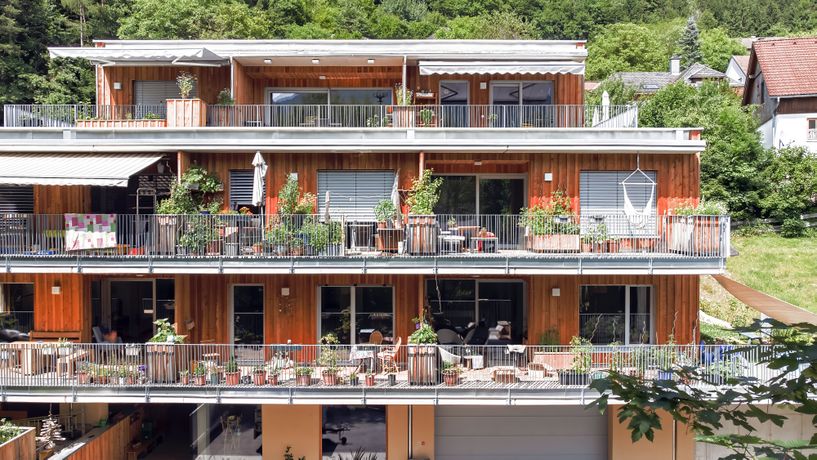 Am Rand von Waidhofen an der Ybbs fand sich ein Grundstück mit 2.622 m² auf einem sehr steilen Hang, zwei Architekt:innen bat man um Entwürfe, das ortsansässige Büro w30 machte das Rennen. „Ich wollte immer schon ein gemeinschaftliches Wohnprojekt planen“, sagt Projektleiter Martin Pichler. Das Anforderungsprofil war klar: Ein Holzbau mit hohem Eigenleistungsanteil, zwölf Wohnungen voller Licht und Luft, außerdem eine Vielfalt an Gemeinschaftsflächen.