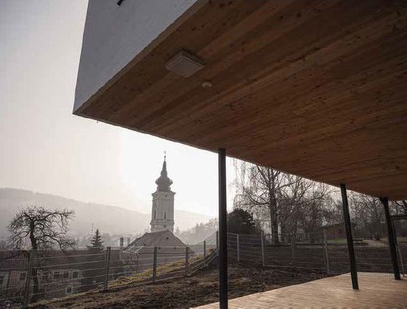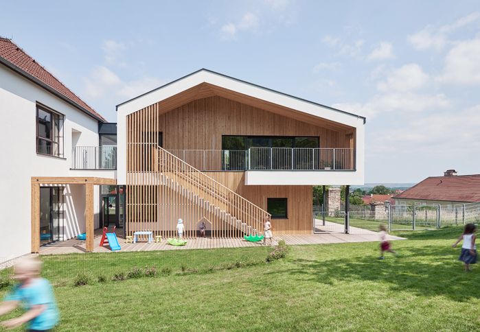 Im Erdgeschoß des Neubaus ist ein Multifunktionsraum integriert, der auch für öffentliche Veranstaltungen der Gemeinde genutzt werden kann. Direkt darüber befinden sich die Räumlichkeiten für eine neue Gruppe mit einer Loggia, welche den Kindern einen herrlichen Ausblick in Richtung Stift Göttweig gewährt und einen zusätzlichen Frei- und Spielraum schafft. Ein Verbindungs-Holzpavillon öffnet sich mit großzügigen Terrassen zum zentralen Kindergartenplatz.