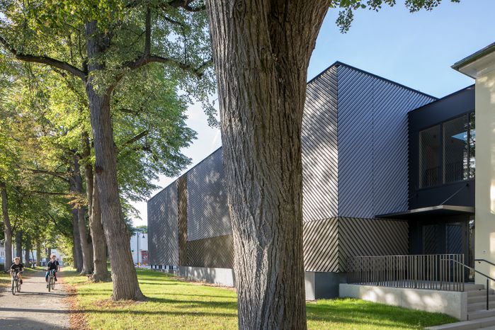 Die Fassade ist mit Holzlamellen verkleidet, die je nach Betrachtungswinkel und Lichteinfall für ein anderes Erscheinungsbild sorgen. Die unterschiedlich dichte Anordnung der Latten greift die verschiedenen Funktionen im Gebäude auf und gibt zudem einen Hinweis auf die Nutzung der dahinterliegenden Räume. Darüber hinaus dienen die Holzlamellen zur Beschattung. Eine (sommerliche) Überhitzung des Gebäudes wird unter anderem dadurch verhindert und stattdessen ein Raumklima geschaffen, das den Bedürfnissen und dem Wohlbefinden der unterschiedlichen Nutzer:innen gleichermaßen Rechnung trägt.