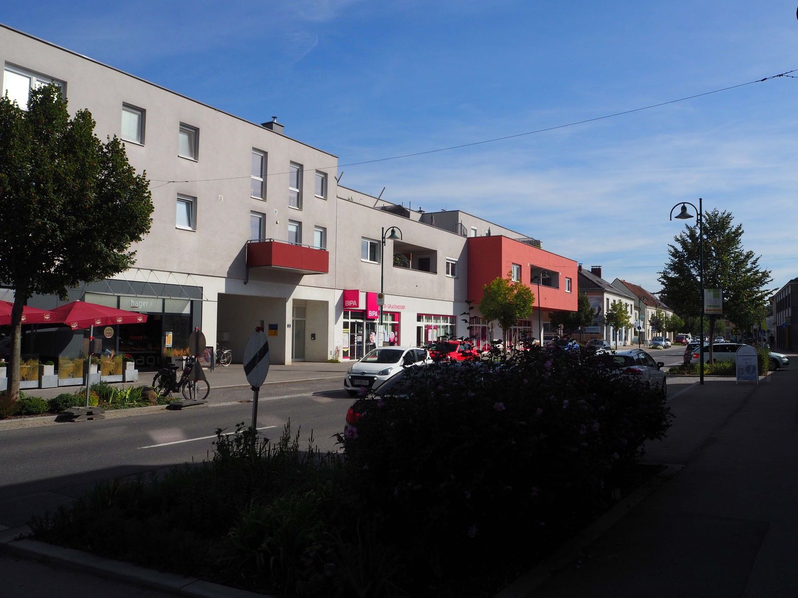 Das Leuchtturmprojekt der Gemeinde stellt der neue Hauptplatz dar (Planung: schumacher.schindl.freiß), bei dessen Errichtung 2021 nicht nur eine dem Ortsmaßstab angepasste Neubebauung errichtet, sondern auch der gesamte öffentliche Raum klimagerecht umstrukturiert wurde. Über einer Tiefgarage entstand ein neues Ortszentrum mit geschäftlich genutzter Erdgeschoßzone und mit darüberliegenden Wohnungen und einem von der Bevölkerung gewünschten Ärztezentrum. Alle Dächer sollten begrünt ausgebildet werden. Um unterschiedliche Funktionen unterzubringen (Bauernmarkt, Treffpunkt, Aufenthalt, Schanigarten u.v.m.), wurde die Hauptstraße verlegt und der Platz vergrößert. Die gepflasterten Platzoberflächen wurden versickerungsfähig und rund um das renovierte gründerzeitliche „Rothaus“, dessen künftige Nutzung noch offen ist, unversiegelt ausgeführt. Das Platzmobiliar umfasst Trinkbrunnen, Pergola, Schattenspender und Sitzbänke. Die Bepflanzung wird von Sträuchern und Beeten gebildet und ergänzt den weitgehend erhaltenen historischen Baumbestand. Auch die Plätze rund um die Kirche und das Gemeindeamt wurden im Zuge der Zentrumsentwicklung erneuert und barrierefrei gestaltet. Die gelungene neue Platzfolge erzeugt eine angenehm ruhige und zurückhaltende Stimmung.