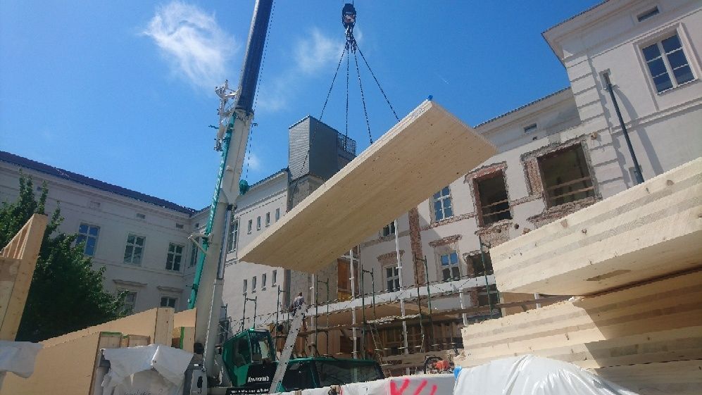 Als Bauweise wurde Holz-Stahl gewählt, weil die Errichtung so rasch und so trocken wie möglich vonstattengehen soll. So kann mit hohem Vorfertigungsgrad und daher weniger Staub- und Lärmentwicklung, leicht und schlank, mit sehr guten Dämmwerten gebaut werden.