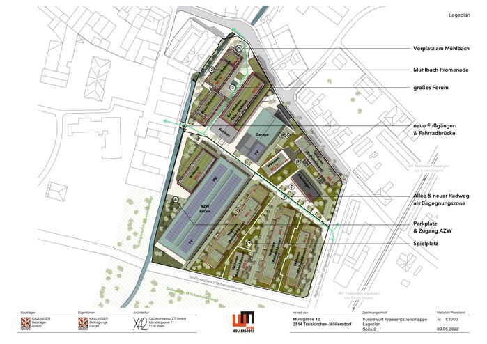 Das Umnutzungskonzept „WERK MÖLLERSDORF“ strebt einen attraktiven Stadtteil mit gemischt genutzten Flächen an, der durch gezielte städtebauliche Eingriffe das nahegelegene lokale Ortszentrum beleben und aufwerten soll. Zwei gestalterisch anspruchsvolle Hallen bleiben erhalten. Die übrige Bebauung wird durch teils aufgestockte, teils neu errichtete Gebäude ersetzt bzw. ergänzt. Die Neustrukturierung schreibt das lineare Grundmuster der Bestandsbebauung durch in der Höhe moderat gestaffelte und mit rundumlaufenden Freiräumen ausgestattete Wohnzeilen fort. Mit Hilfe von differenzierten Grundrissen und Größen strebt das Wohnungsangebot eine durchmischte Bewohner:innenschaft an. Fassadenberankungen, Dachbegrünungen und Photovoltaikanlagen auf den Bestandshallen sowie Erdwärmenutzung gewährleisten ein klimagerechtes und ökologisch verträgliches Projekt mit einer neutralen CO2-Gesamtbilanz. Die Freiräume sollen weitgehend entsiegelt werden. Neue Wege und Brücken über den Mühlbach - auch für Radfahrer:innen - und die Vergrößerung der bestehenden Freiflächen sollen das Areal künftig zu den Nachbarschaften in alle Richtungen öffnen. Gemischtgenutzte Gebäude sollen ein lebendiges Milieu generieren, das als Ergänzung zu den bestehenden Angeboten der Umgebung (Fleischer, Bäcker, Gastwirt) den Ortskern sozioökonomisch aufwertet und neue Arbeitsplätze schafft: Geschäfte, Museum und Depot sowie, zum Teil auch in den Obergeschoßen, Raumangebote für Dienstleistungen. Durch den Erhalt der historischen Giebelwände und die Rückstaffelung der Kubaturen an der Mühlgasse respektiert das Projekt den Maßstab der Umgebung. Die für den Stadtteil wohl attraktivste Maßnahme stellt die Öffnung des Mühlbaches an der Mühlgasse dar, der an dieser Stelle eine neue Brücke erhält und gemeinsam mit einem neuen Vorplatz künftig zum Treffpunkt, Aufenthalts- und Identifikationsort werden kann.