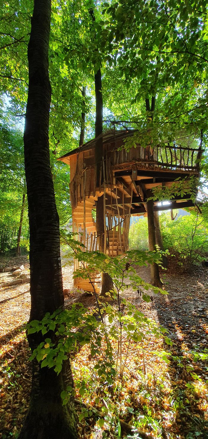 In einer zweiten Stufe wurde der Randbereich des Waldes in die Gestaltung mit einbezogen und weitere räumliche Elemente zur Vermittlung von Wildnis geschaffen. Unter der federführenden Planung von Arch. Gruber entstanden Baumhaus, Schlafhütte, überdachte Lagerfeuerstelle, Sandmulde usw.