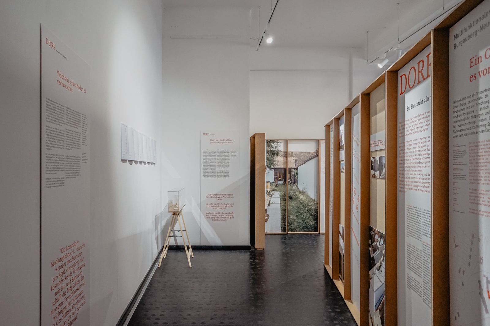 Die Ausstellung zeigt jenen Wohnbau am Land, der auf die gewachsenen Dorfstrukturen reagiert und das Haus als Dorfbaustein versteht. Mit beispielhaften Projekten werden Typologien vorgestellt, die in historisch gewachsenen Parzellen Platz finden und innerdörfliche Flächen gut nützen. Der Fokus liegt dabei auf dem Hof, der als geschützter Freiraum ein attraktives Wohnen ermöglicht. Die Zusammenhänge zwischen dem Wohnen und den Infrastrukturen des Dorfes werden beleuchtet, die das tägliche Leben erleichtern, die Ortskerne stärken und die wachsenden Ansprüche an die Wohnfläche kleiner werden lassen.